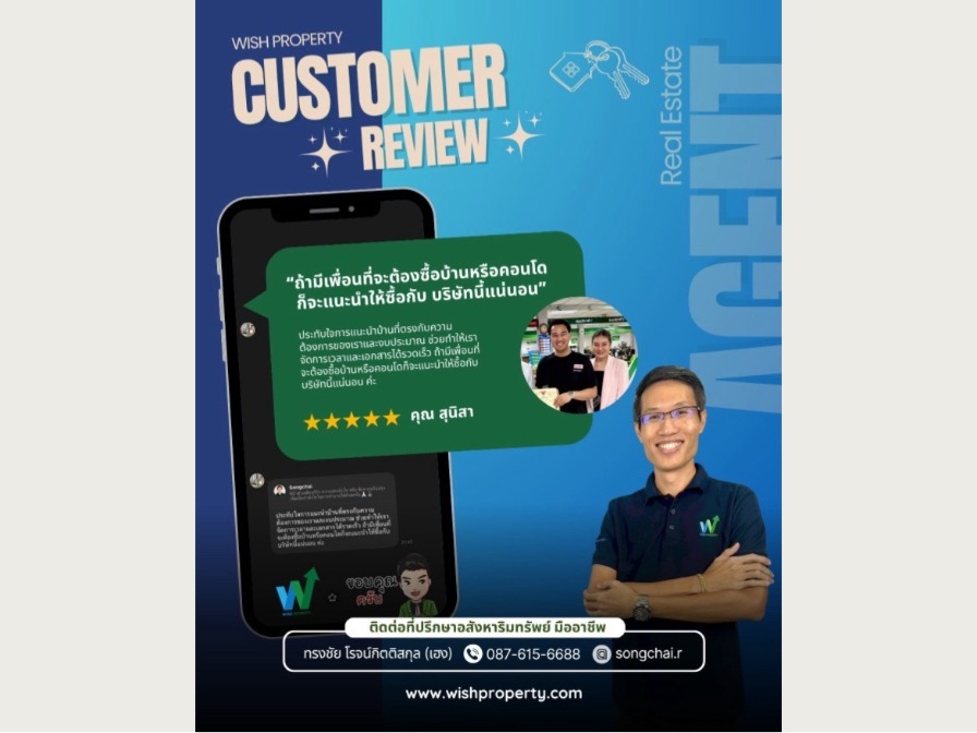 "ถ้ามีเพื่อนที่จะต้องซื้อบ้านหรือคอนโดก็จะแนะนำให้ซื้อกับ บริษัทนี้แน่นอน" ประทับใจการแนะนำบ้านที่ตรงกับความต้องการของเราและงบประมาณ ช่วยทำให้เราจัดการเวลาและเอกสารได้รวดเร็ว